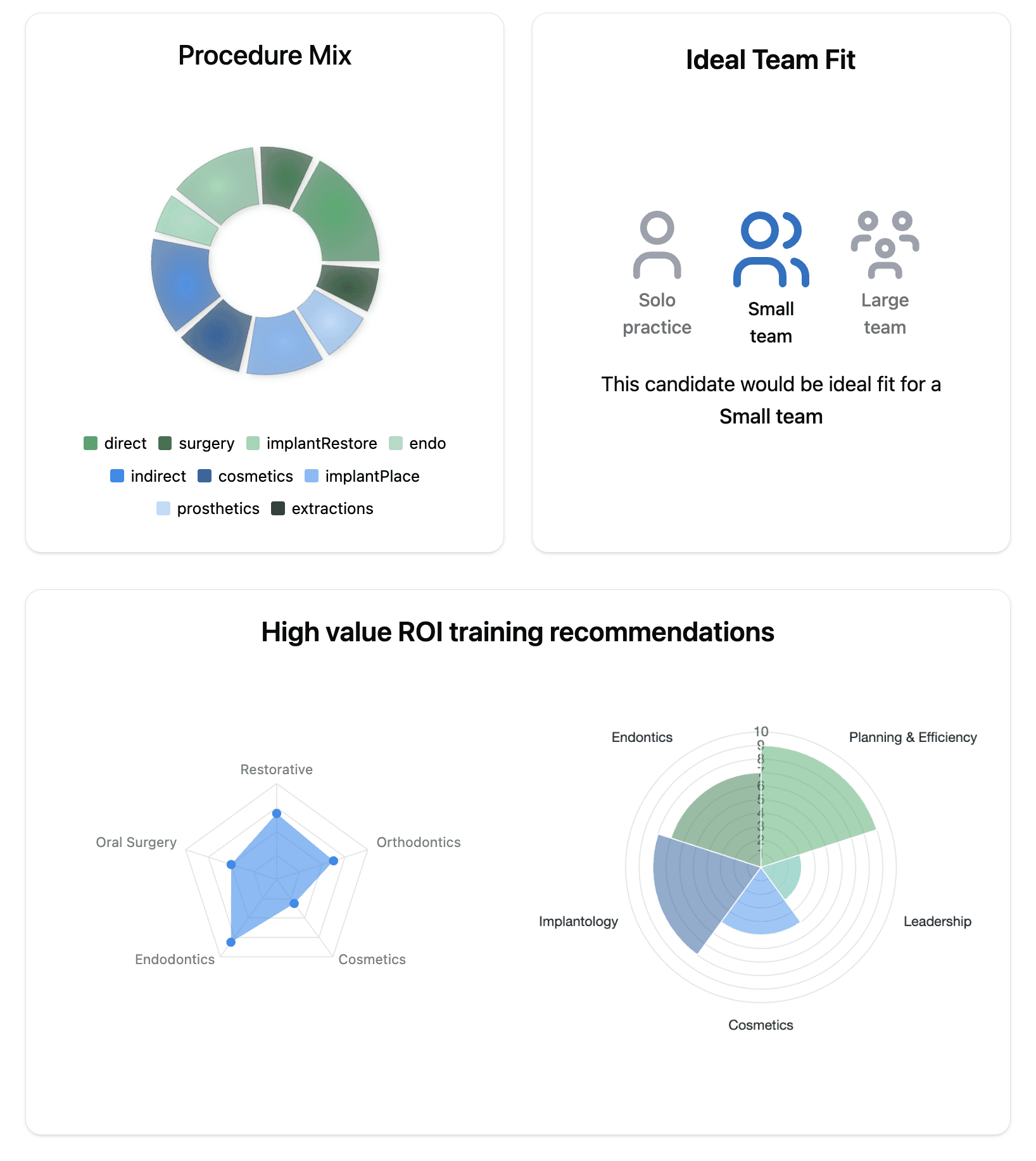 Clinsight uses AI to analyze a candidate’s clinical decisions, treatment patterns, and behavioral traits to accurately forecast their monthly production—helping practices predict financial impact before making a hire.