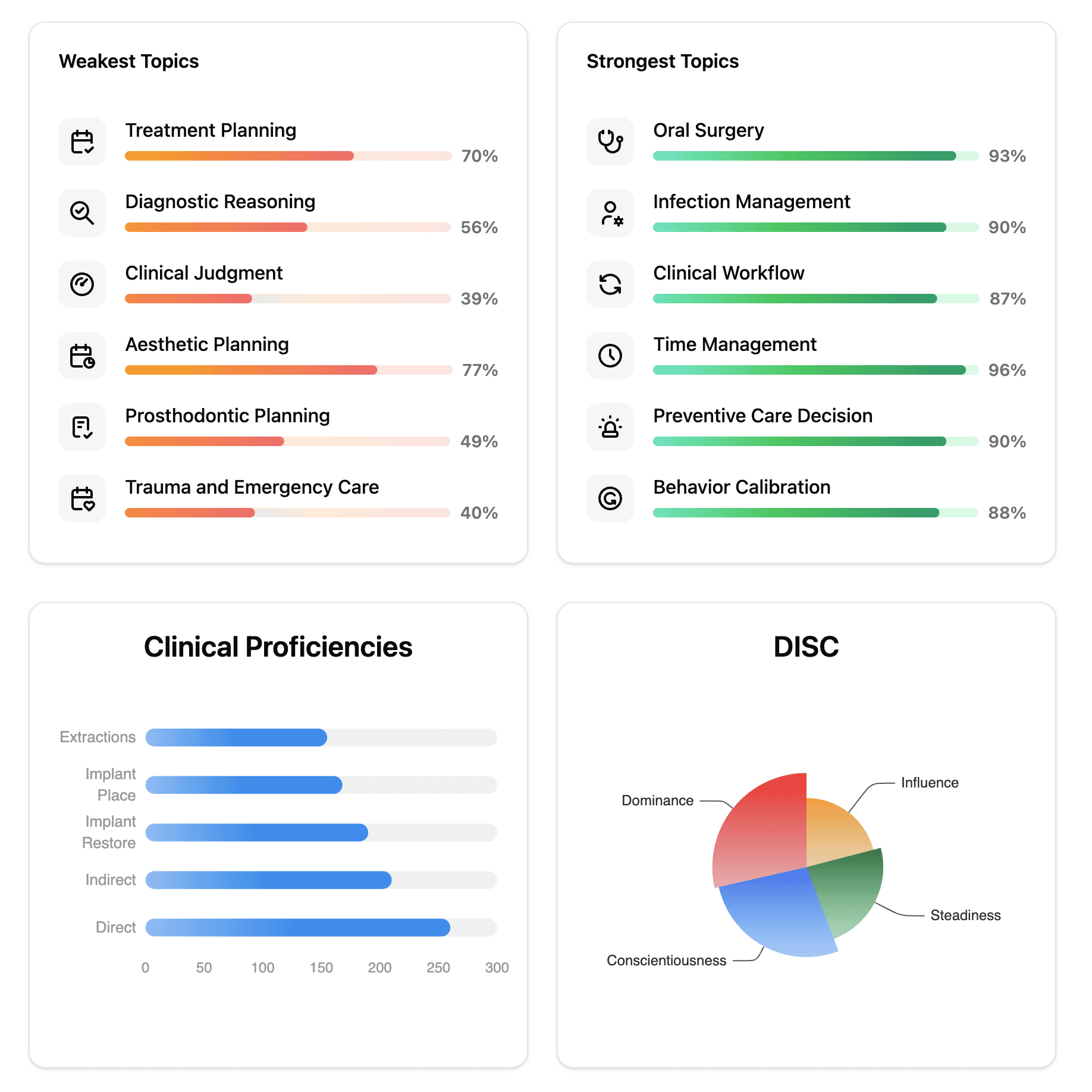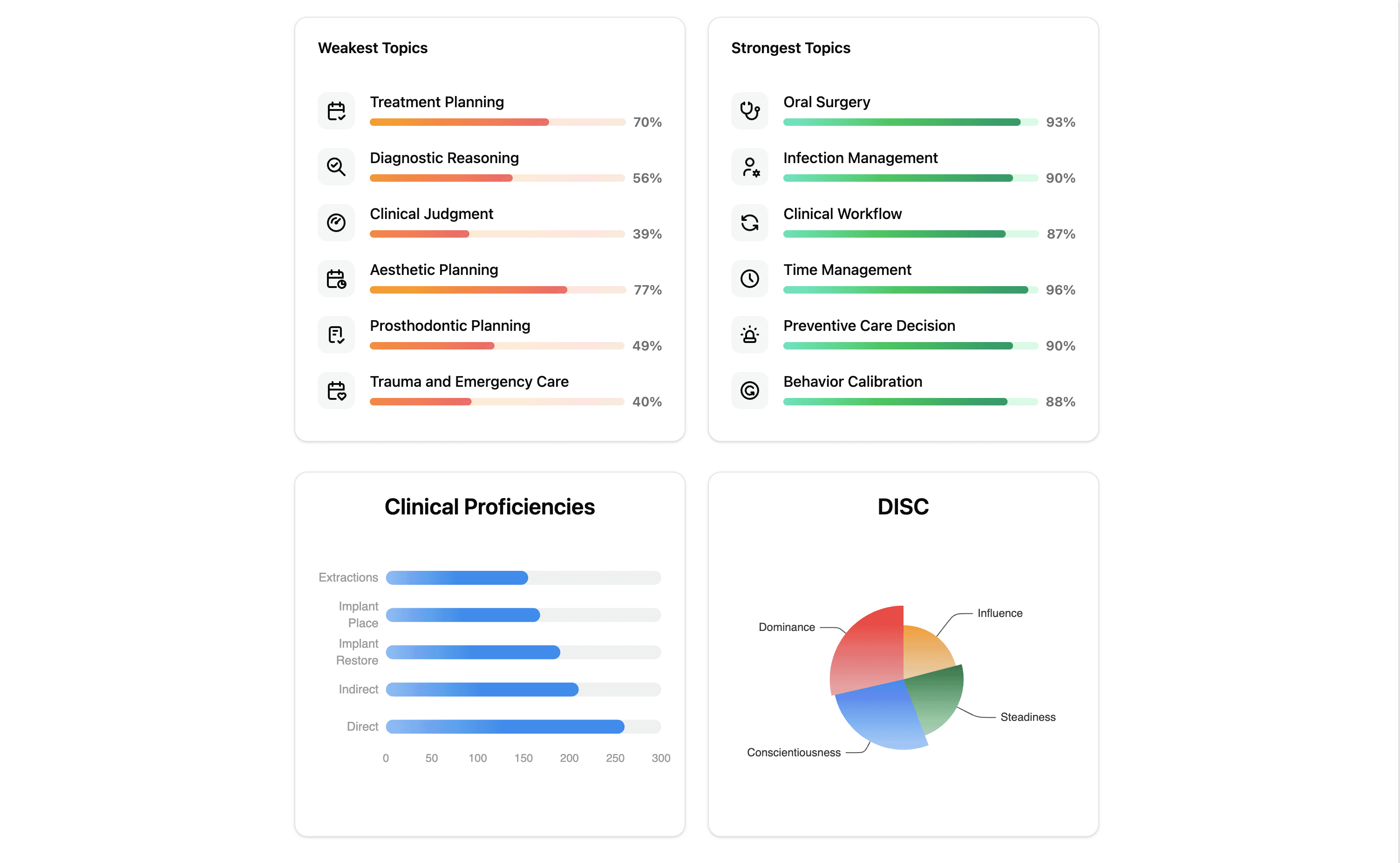 Clinsight’s AI transforms résumés and performance history into detailed provider scorecards that evaluate clinical skills, behavioral traits, and cultural fit. Each scorecard predicts production, case acceptance, and patient satisfaction—giving practices data-driven confidence before every hire.