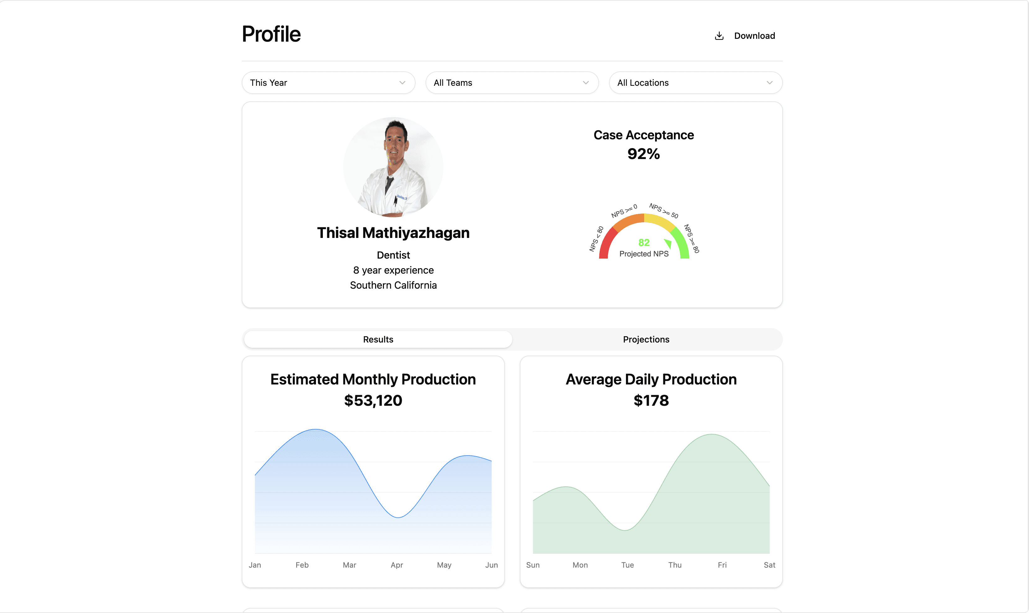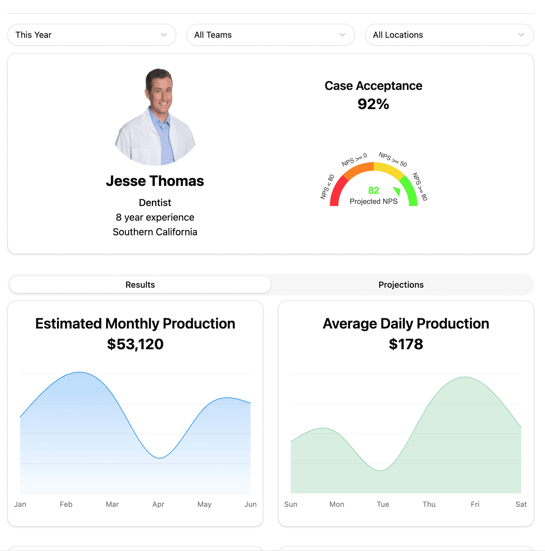 Clinsight’s AI forecasts a provider’s estimated monthly production, case acceptance, and patient satisfaction before they ever join your team. By analyzing past performance patterns, clinical mix, and behavioral data, Clinsight empowers practices to predict ROI, reduce hiring risks, and plan growth with precision.